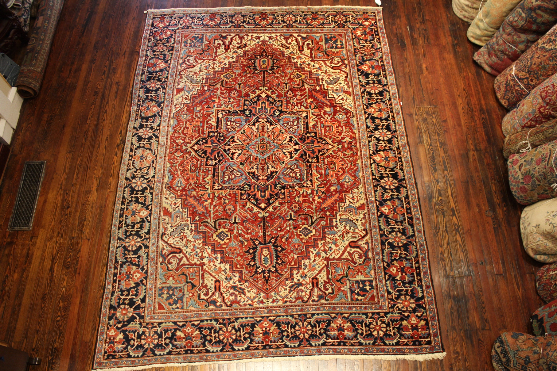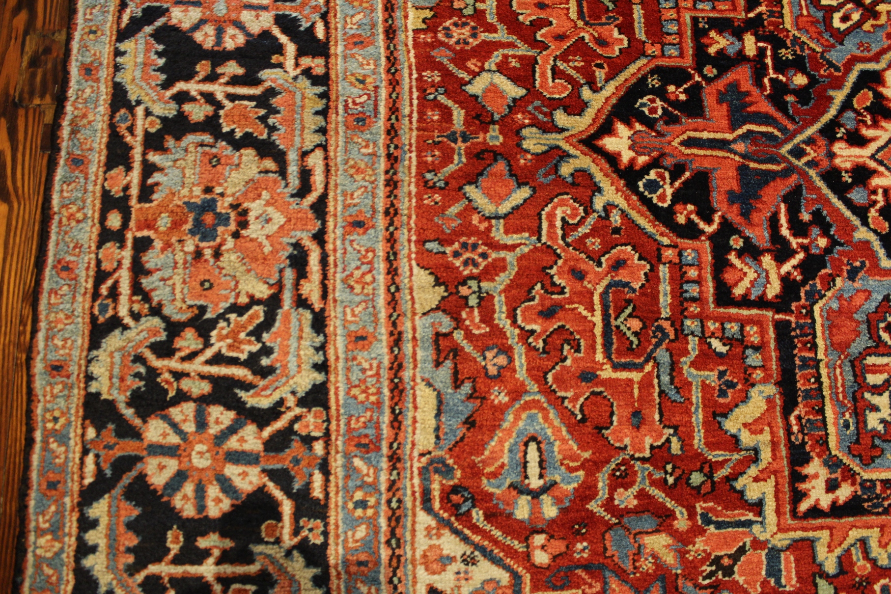 Heriz rugs are woven in the area of Heriz in northwest Iran, northeast of. Such rugs are produced in the village of the same name in the slopes of Mount Sabalan. Heriz carpets are durable and hard-wearing and they can last for generations. Part of the reason for the toughness of Heriz carpets is that Mount Sabalan sits on a major deposit of copper. Traces of copper in the drinking water of sheep produces high quality wool that is far more resilient than wool from other areas. The Heris Carpet is the only carpet in the world where stories of the Old times are woven. Heriz rug weavers often make them in geometric, bold patterns with a large medallion dominating the field. Such designs are traditional and often woven from memory.